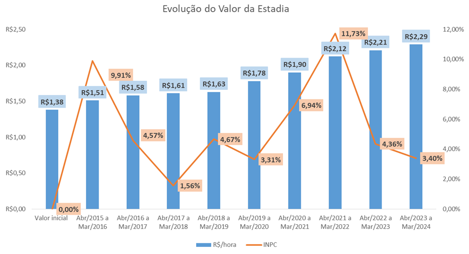 Considerando o valor anterior, ou seja, antes do reajuste, teríamos uma estadia de R$ 79,56 para a mesma operação citada no exemplo. Em números absolutos, uma variação de R$ 2,88 a mais no custo da operação.