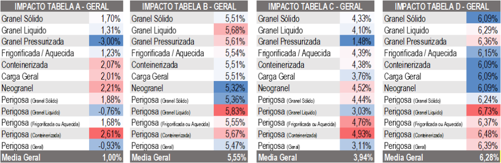 Isoladamente, se analisarmos a categoria de carga perigosa (granel liquida) – tabela D, considerando as variações dos coeficientes previstas na legislação, atingiu a maior variação entre das demais com 6,73% de reajuste.