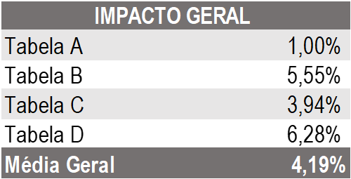 Avaliando os tipos de tabela contempladas na resolução, podemos concluir quem sofreu o maior impacto foi a Tabela D, quando a contratação apenas do veículo automotor de alto desempenho, com 6,28% de aumento em relação a resolução anterior.