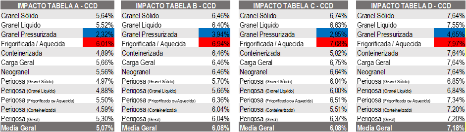 Isoladamente, se analisarmos as categorias de carga, quem sofreu o maior impacto foi o transporte de frigorificada / aquecida (CCD) – tabela D, considerando as variações de CCD previstas na legislação, atingindo 7,97% de aumento.